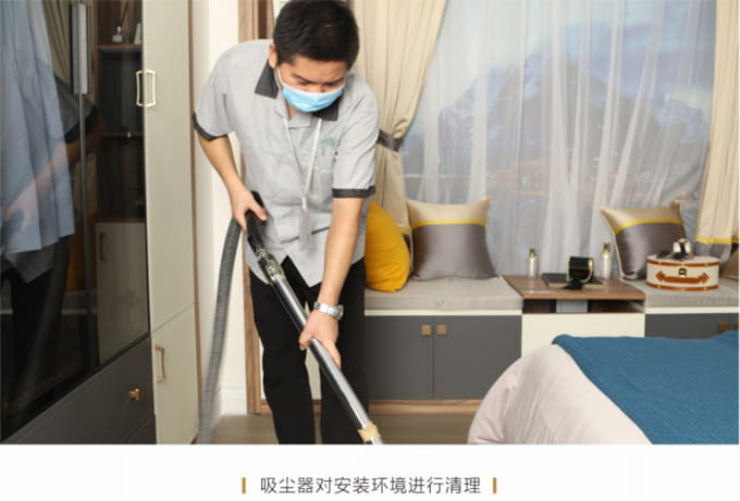 產品安裝確認無誤后及時清理房間內因安裝產生的垃圾并保持空氣流暢,然后用干凈的抹布將家具擦拭一遍,確保產品清潔,用吸塵器對安裝環境進行清理,并對所有安裝好的產品拍攝記錄作為完工效果備案。